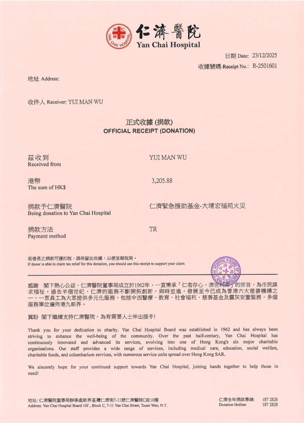 Bank transfers to both donation recipients have now been successfully completed. We have received the donation receipt from Yan Oi Tong “Love and Care” Emergency Fund and Yan Chai Emergency Assistance Relief Fund.
